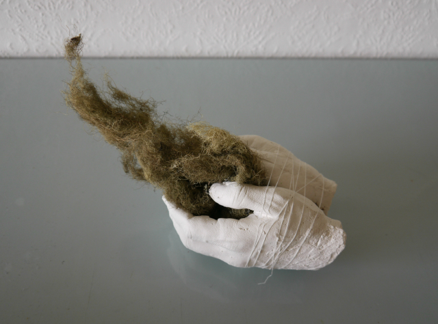 Materials: Swedish police hands casted in plaster, fishbone beard lichen, cotton thread